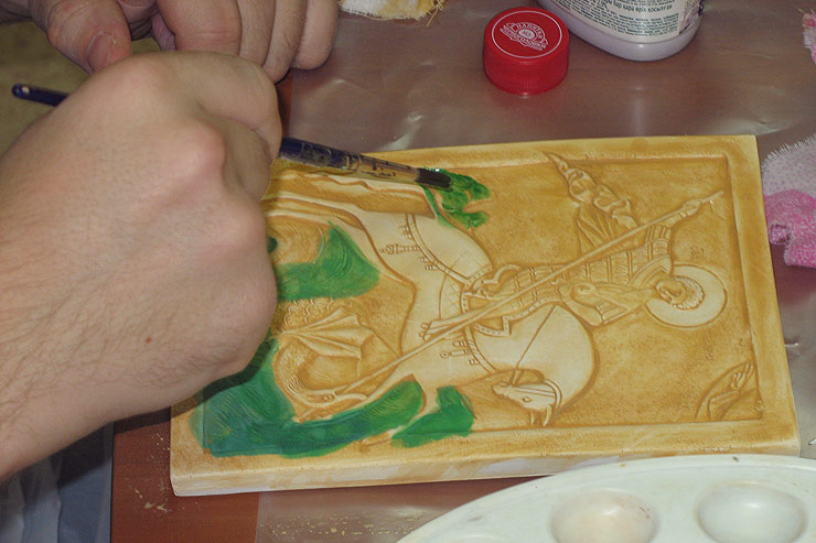 Практическая часть занятия состояла в цветной росписи по гипсу — создании репродукции по мотивам известной иконы XIV века «Чудо Георгия о змие», хранящейся в Государственном Русском музее.
