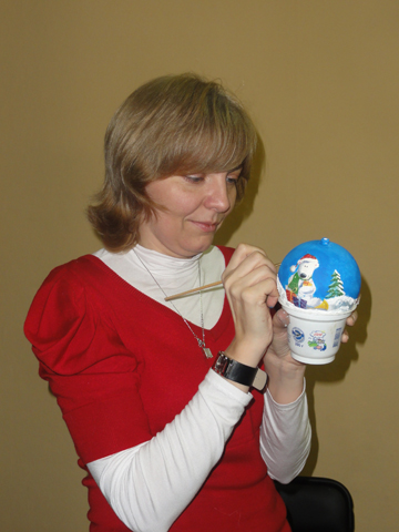 А в это же самое время, кто-то знакомился с декупажем. Из простых, однотонных шаров на елку в результате появились авторские, непохожие друг на друга произведения. Даже снег казался настоящим!