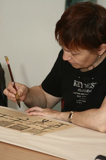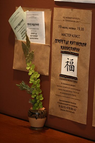 Занятие началось с рассказа о мастерах китайского искусства и просмотра фрагментов фильмов как работают мастера каллиграфии. Затем все участники попробовали написать некоторые знаки, получив объяснение значения и использовав рекомендации мастера по технике нанесения мазков кистью. В конце каждый сделал подарок своим близким, скопировав иероглиф «Счастье» на красивейшее стеклянное панно. Подарок от сердца к сердцу.